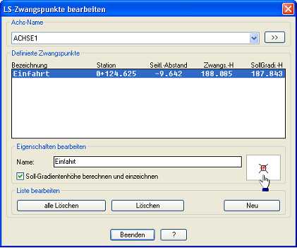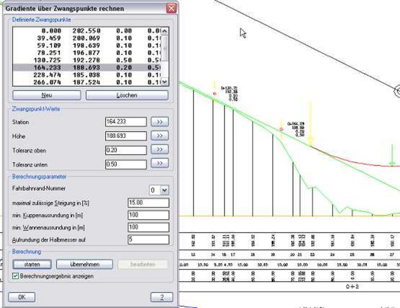 In der RZI Software definieren Sie Zwangspunkte im Lageplan. Die Software ermittelt automatisch die zugehörige Station, den Abstand und die erforderliche Soll-Gradientenhöhe. Zudem kann die RZI Software eine optimale Gradiente berechnen, die alle vorgegebenen Zwangspunkte (unter Berücksichtigung von Toleranzen, Minimalradien und maximalen Steigungen) automatisch einhält.