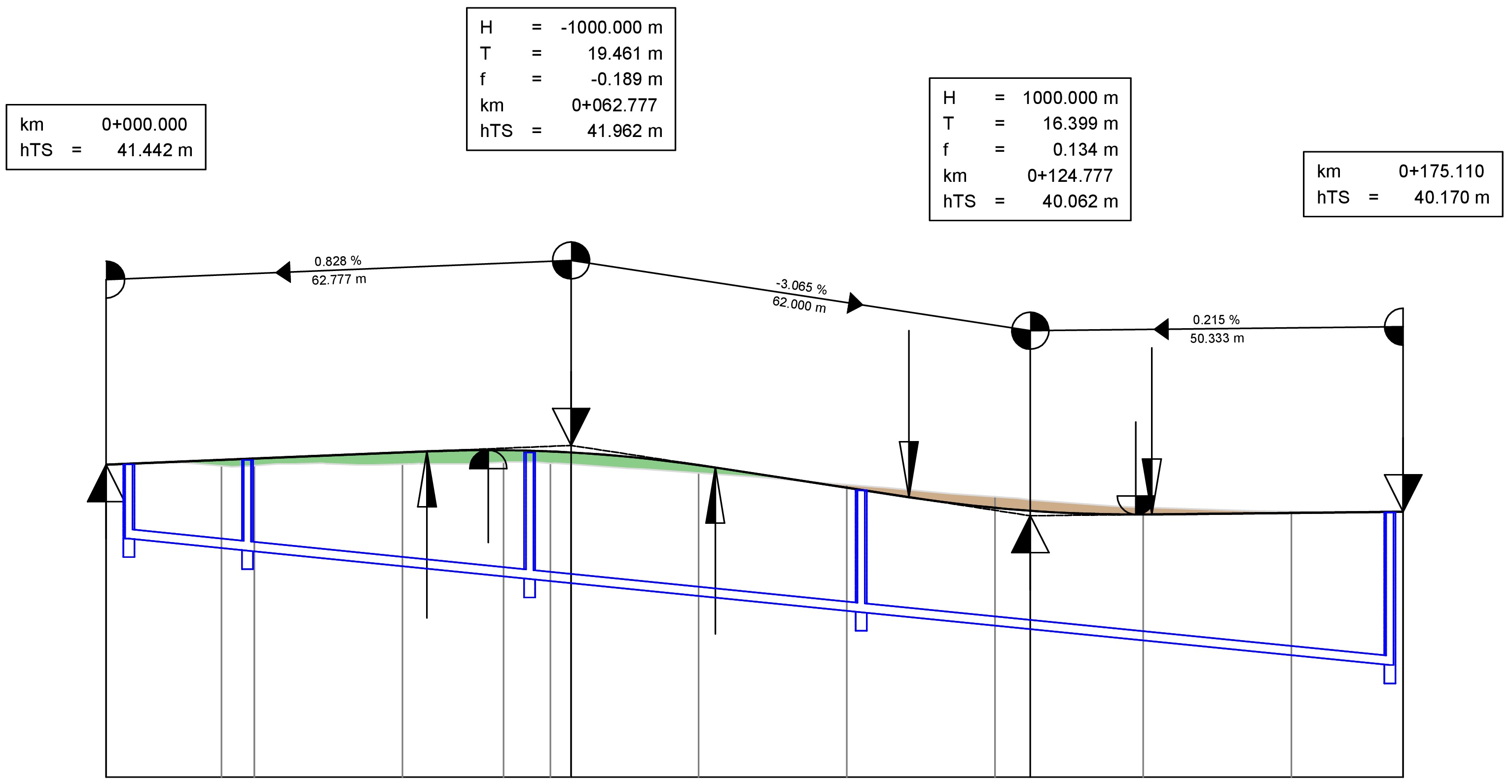 Gradiente (Projektierte Linienführung): Dies ist die geplante vertikale Trasse der neuen Straße. Ihre Konstruktion bestimmt, wie sanft oder steil die Straße verläuft, wo Kuppen und Wannen liegen und wie die Straße an die Umgebung (z.B. Brücken, Hofeinfahrten, Kreuzungen) angeschlossen wird.